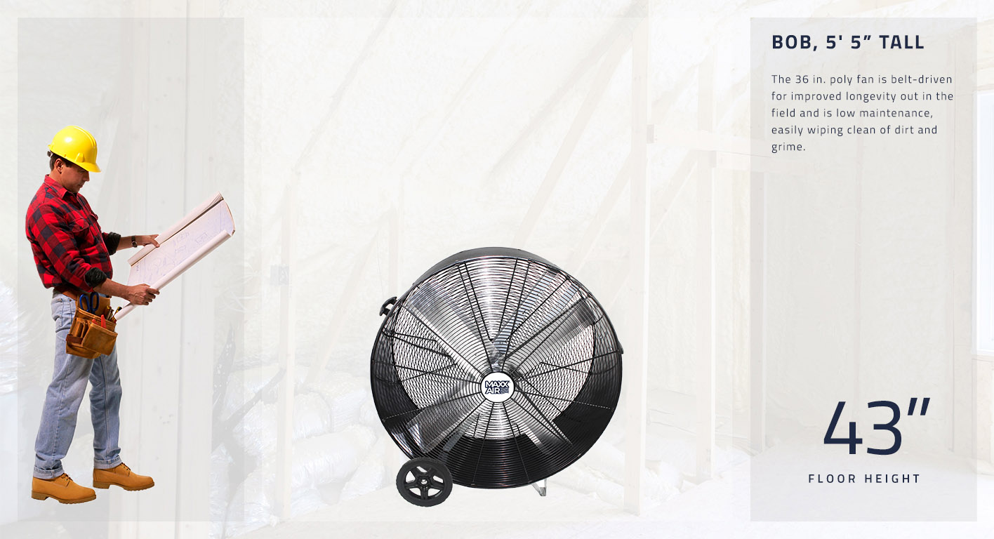 This Maxx Air Pro FLEX 36 In. Belt Drive Barrel Fan can be used for medium- to large-sized indoor ventilation needs. Keep people and industrial machines cool in a warehouse, help dry water-damaged areas, speed up the curing process of concrete or tile projects on a construction site job or utilize it as an air circulator in a gym, shop, or commercial auto garage to create a comfortable working environment. Our FLEX models are constructed using high density polyethylene and feature heavy duty angled struts to add strength to the fan, giving it the ability to withstand impacts that would otherwise dent a metal housing. This air mover is fully assembled and ready to work—transport it anywhere using the on-board handles with cord wrap and 9 in. wheels. Control your level of air circulation between low and hi speeds via a rocker switch on the rear grille.