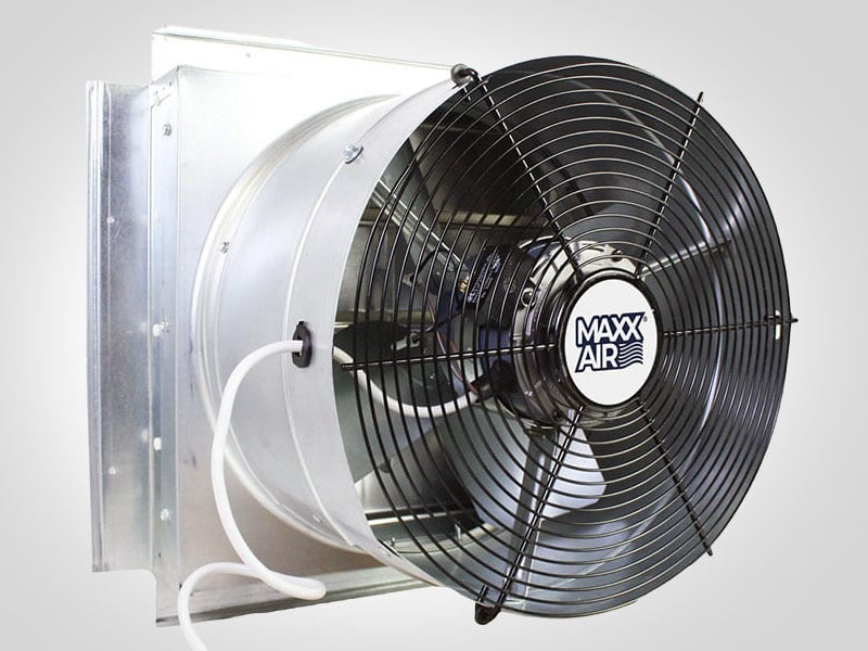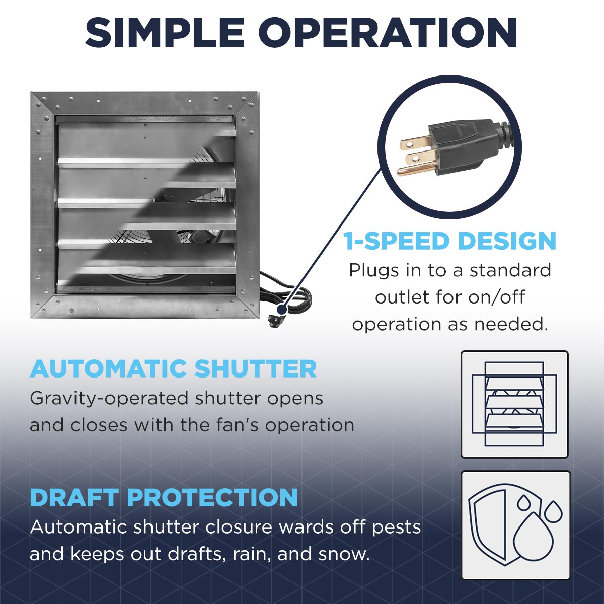 The Maxx Air Rugged® Series Exhaust Fans can be used in a garage, barn, greenhouse, warehouse, and a variety of other agricultural and industrial locations to quickly remove unwanted odors, dust and humidity, and refresh stale or warm air in your space. This ventilation fan is constructed of a sturdy, reinforced 20 gauge steel housing with improved aluminum louvered shutter for an even tighter closure than before, a safety grille and a totally enclosed, thermally protected motor. Arrives fully assembled, just mount to your desired building wall and plug in to your nearest 120V outlet to complete installation.