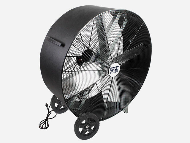 Drum fans move significantly more air than standard fans and are built for larger spaces and heavier-duty use. A high-velocity drum fan like the Maxx Air model is the better choice when you need powerful, consistent airflow in industrial or jobsite environments.