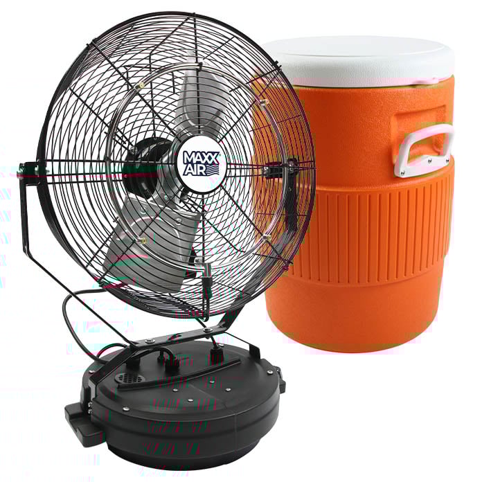The Maxx Air 18 in. misting fan is a cost-effective solution for industrial-grade cooling and a popular choice for commercial operations, fire and police departments as a fire ground cooling fan, and athletics programs as a sideline fan to combat heat stress when at work or out in the field. Durable, dependable, and designed to last, this outdoor misting fan comes with a heavy-duty insulated 10 gal. cooler tank and a fan assembly constructed of powder-coated metal with corrosion-resistant, stainless steel hardware tailored for indoor and outdoor use. This portable mister arrives to you fully assembled and ready to go anywhere.