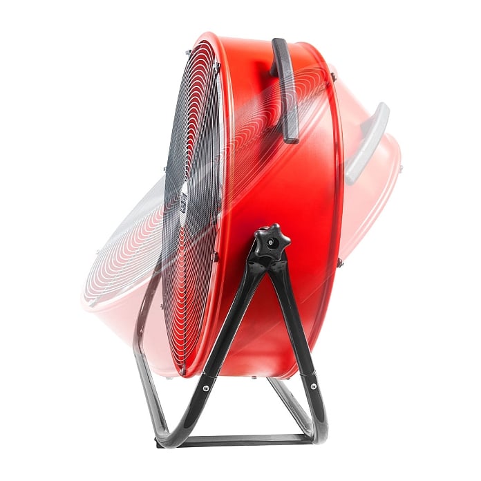 Bid your box fan goodbye! The Maxx Air 24 In. Narrow Profile Barrel Fan is a powerful and portable air circulator used to provide airflow indoors in an industrial shop or warehouse, commercial building, gym, construction site, or even at home in the garage. This high velocity fan has a red low profile steel housing to save space on your floor, tilt adjustment knobs to set your fan at your desired angle, and includes built-in rubber feet for quiet performance along with a cord wrap to keep the 7.5 ft. power cord safely stowed away when not in use. Minimal assembly is required to get started, and the air mover's lightweight design allows you to easily pick it up and move it from room to room as needed. Enjoy 2 cooling speeds and a 180° tilt angle to direct the airflow wherever you need it most.
